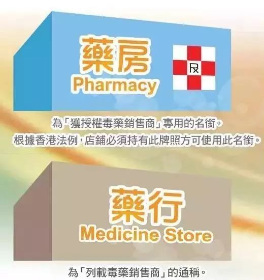藥行沒有聘請藥劑師,不能售賣醫生處方藥物,只能售賣非處方藥物或成藥。有「藥房」或「藥行」字眼的店鋪,代表已於藥劑業及毒藥管理局註冊,及受衛生署監督。