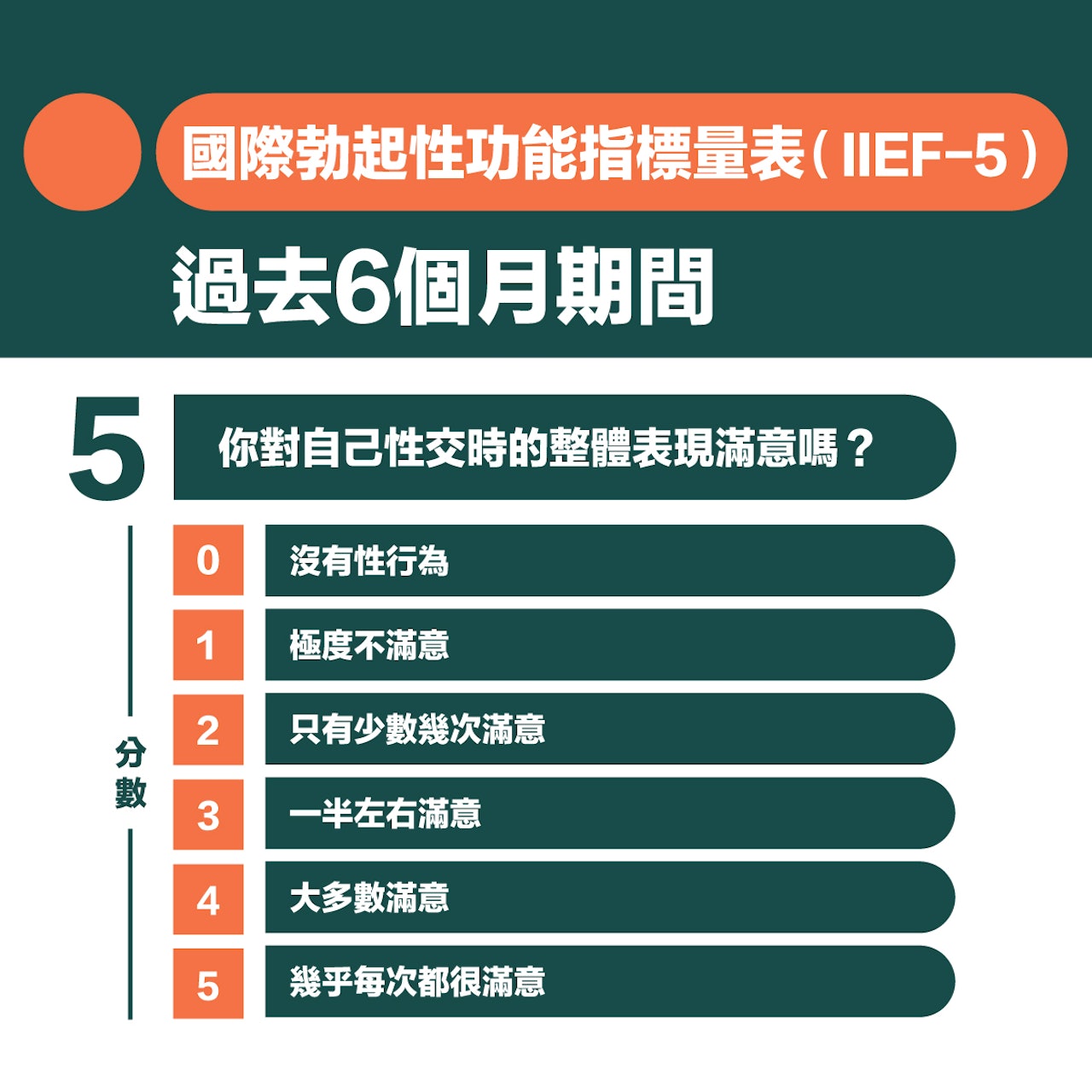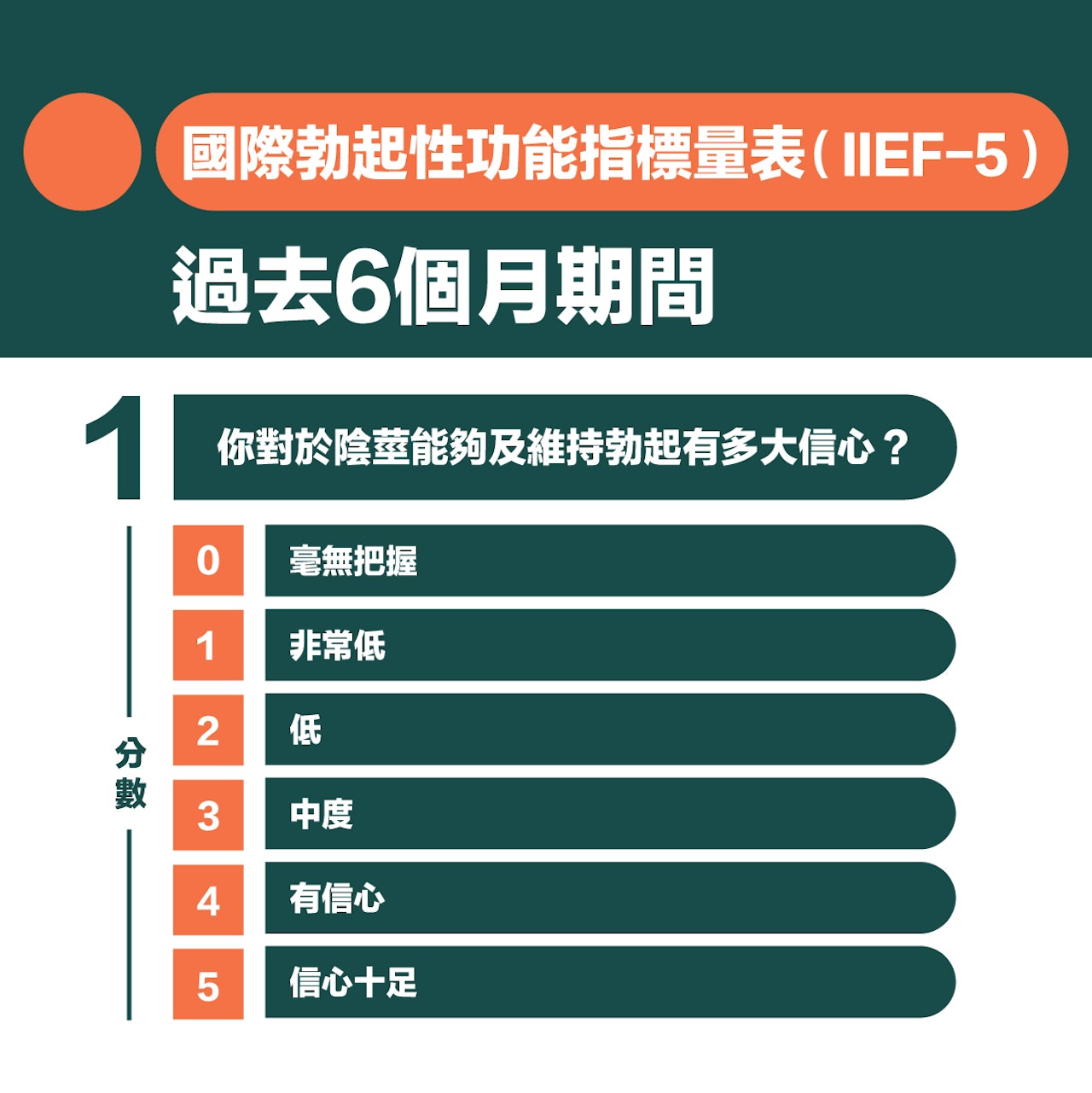 各位男士亦能利用 IIEF(International Index of Erectile Function ) 量表,依照個人狀況,對過去6個月進行簡單初步的自我評估。若得分加總低於或等於21分,就表示可能有「勃起功能障礙」;分數越低,症狀越嚴重,需要及早求醫尋求治療。